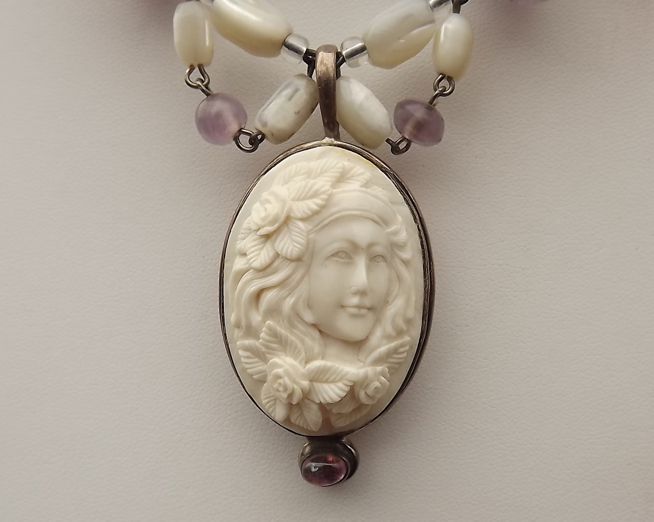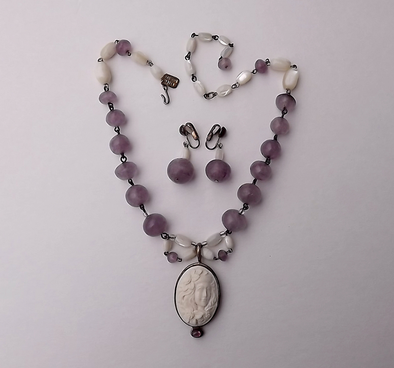 CARVED BONE CAMEO, AMETHYST & MOTHER of PEARL ANTIQUE BEADS NECKLACE EARRINGS SET