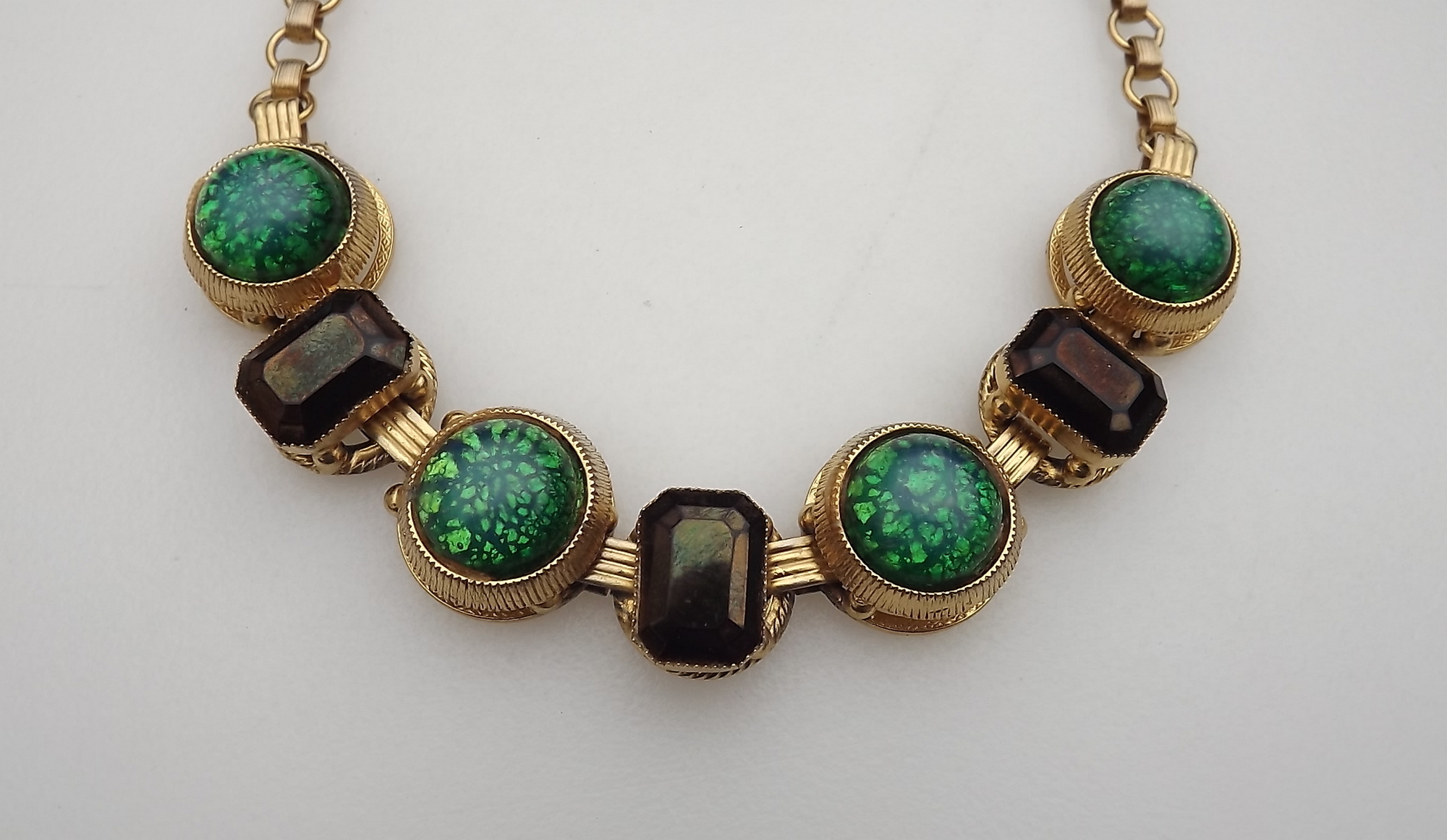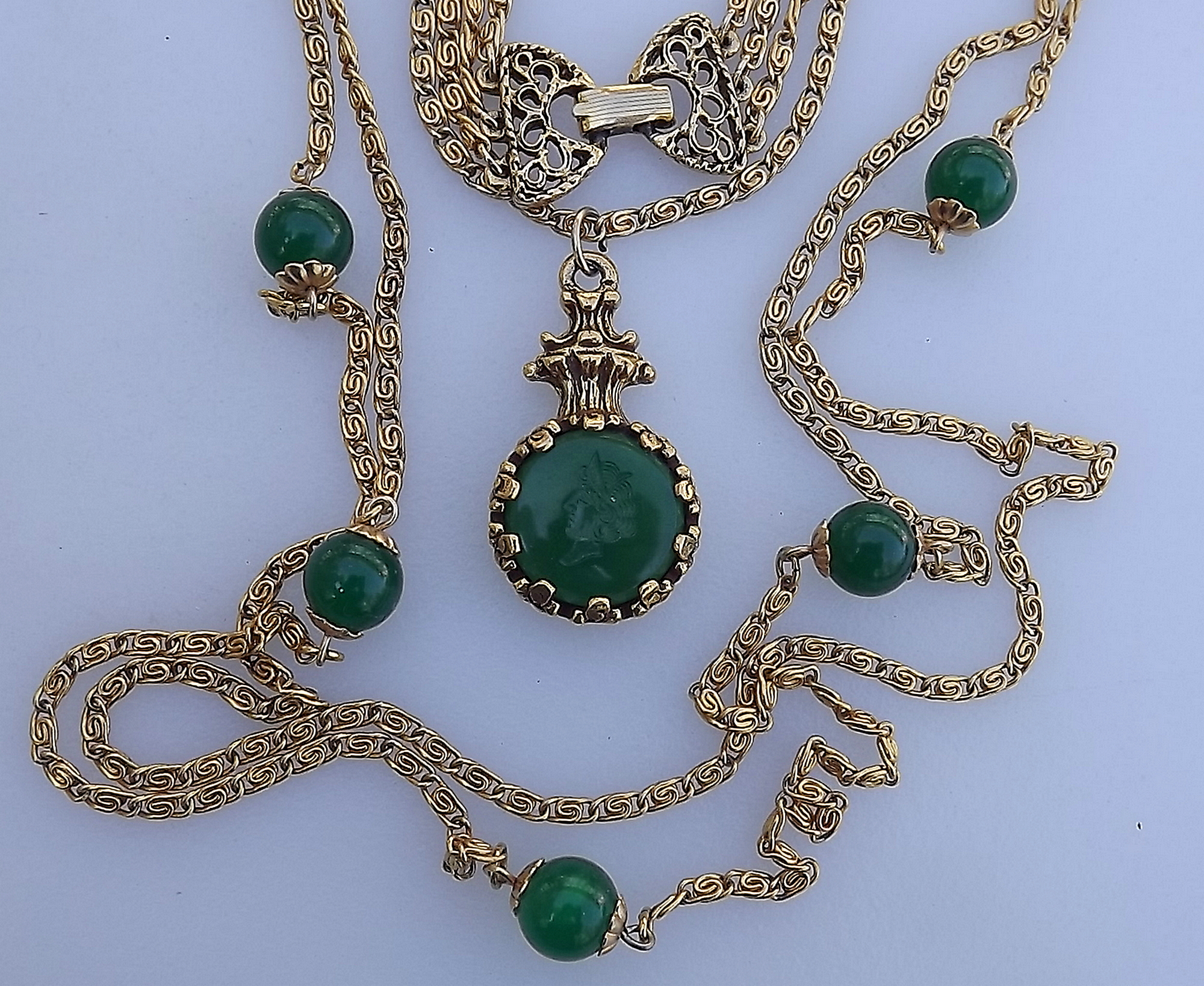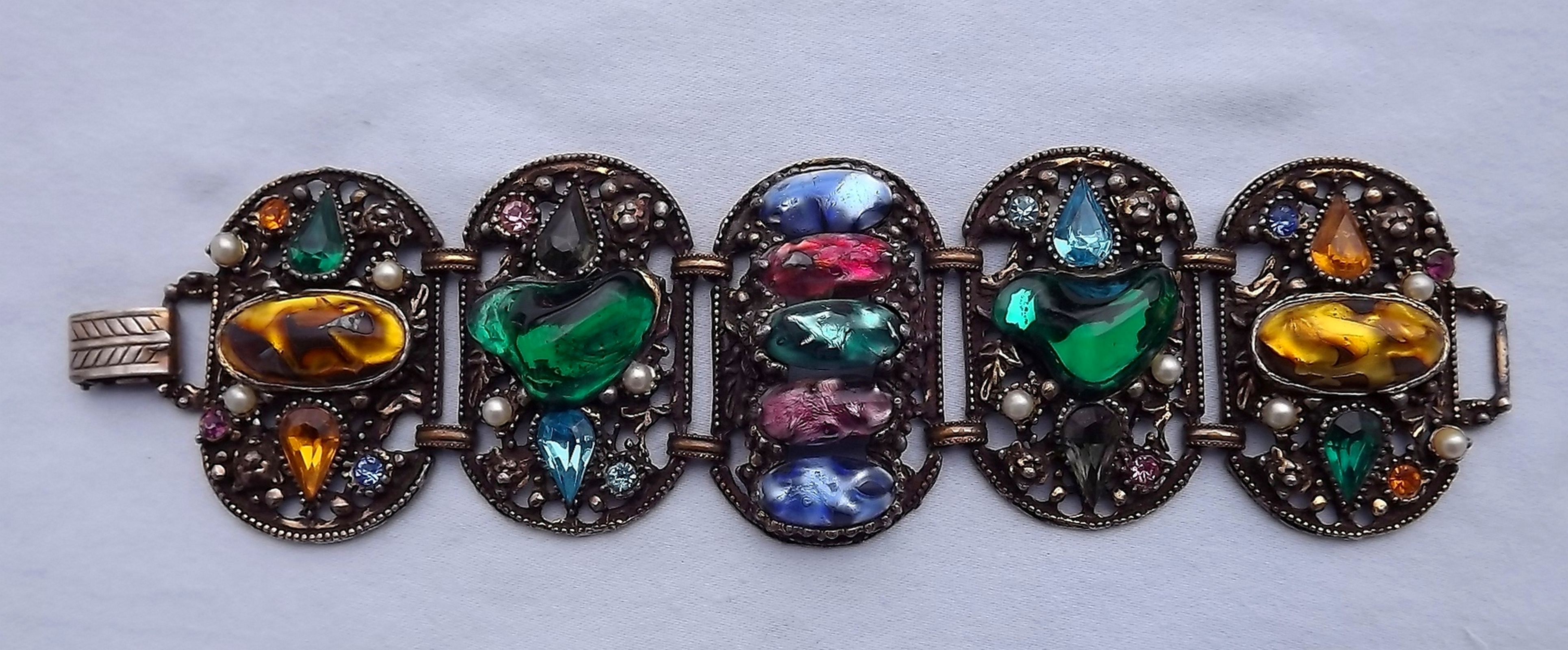 Vintage Sandor Renaissance Revival Hinged Cuff Bracelet Green Peking Glass, Filigree Metal, Old Costume Jewelry MSRP: Was: Now: $135.00 Vintage Sandor Renaissance Revival Bracelet Signed Sandor Patent # 1971084 dates to 1934…