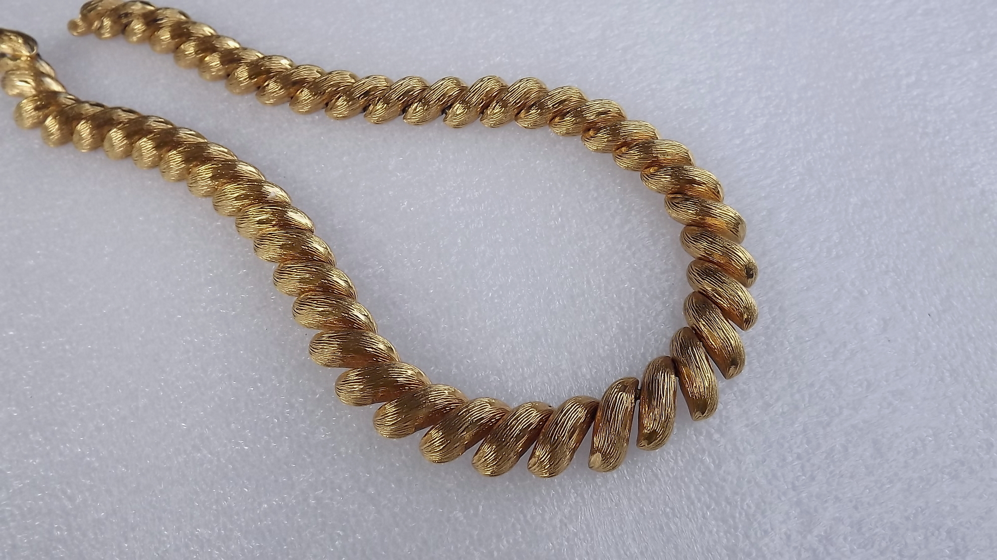 Add to Cart Vintage Gold Necklace Embossed Curb Twist Open Links Gorgeous Finish Resembles Fine Gold Old Costume Jewelry MSRP: Was: Now: $85.00 Stunning Vintage Gold Necklace, The Look of Real! 1960's Gold PlatedFeatures gorge…