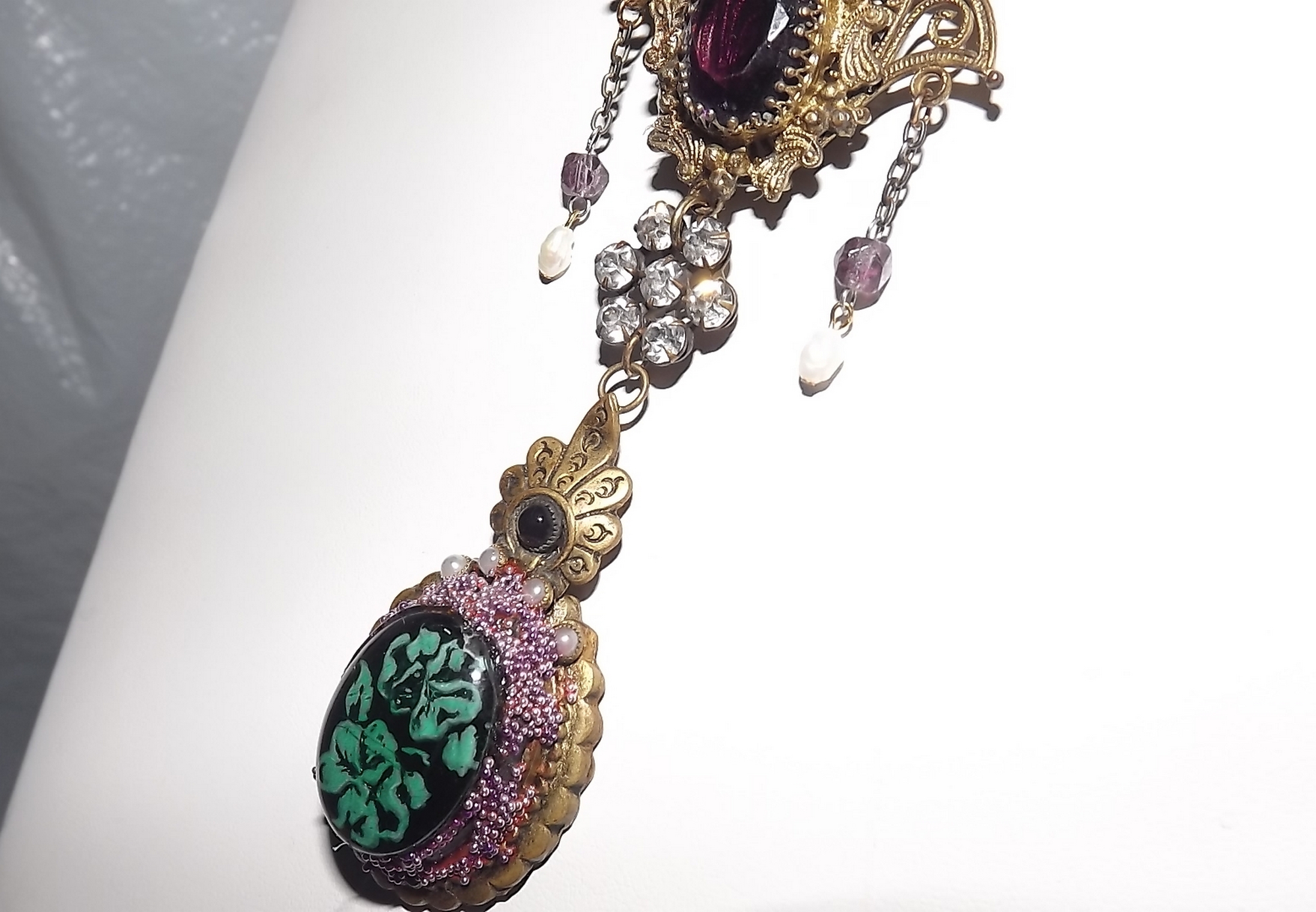 This is a lavalier which features a filigree brass metal station which has a purple faceted glass stone on it. Two very delicate chains with very old, purple, faceted, glass beads and genuine freshwater pearls drop down on either side of it. Below that is another smaller connector, I believe it was originally a button, which has prong set, paste rhinestones in it. This sparkling little item dates to the late 1800's era. Below that is a semi ornate, brass, Czechoslovakian, pendant which has a reversed carved glass stone (I added that) in the center of it. A small, black, glass cabochon is set at the top, and four, small, bezel set, glass cab pearls peek out just below that. The extremely tiny glass spheres you see on that bottom drop are new. I found them so enchanting that I added them to the first two links on the neck chain as well as to my Ellen Original cartouche on the back. The 1960's neck chain is beautifully embossed along with gold beading and in a rich gold plated finish. I added a Czech art glass bead at the end of the extender chain. Necklace measures 17" total adjustable length. Total center drop length measures 4~1/8". The photos do not show the true of the piece. Importantly, you will have a one of a kind art necklace which, by the way, looks fabulous on.